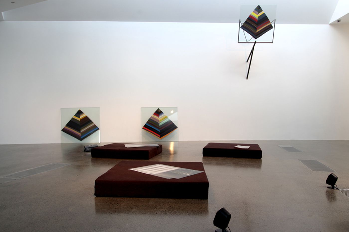 As with Colour Schemes for Screaming Pyramids, previous works use the presence of banners to enact the process by which meaning is ascribed to form. In Chasing Losses (2010), Howden-Chapman performs the narratives that banners help illustrate. In the video documentation of this performance, multiple layers of triangular banners are spot-lit and pinned to a wall. Throughout the performance, Howden-Chapman tells the viewer the names of each banner before unceremoniously unpinning each one and letting it drop to the ground: ‘I’m just gonna run through the titles of these works... ah... so this one is called “Opportunity”... This one is titled “Investment”... This banner is titled “Returns”...’ Much of the language utilised for the titles is pseudo-financial but with each banner, the titles slowly incorporate colour: ‘This banner is named “Returns on colour”... This work is titled “Investment in yellow, pinks, blacks, dark purples and fire-engine red”... This banner is called “Investment in bright red, fire-engine red, blood red, pink, bright purple, camel, sand, pink, band-aid pink, Russian sand...’ Colours are emotive, often symbolic, begging the question of how one might invest in them or receive returns.
