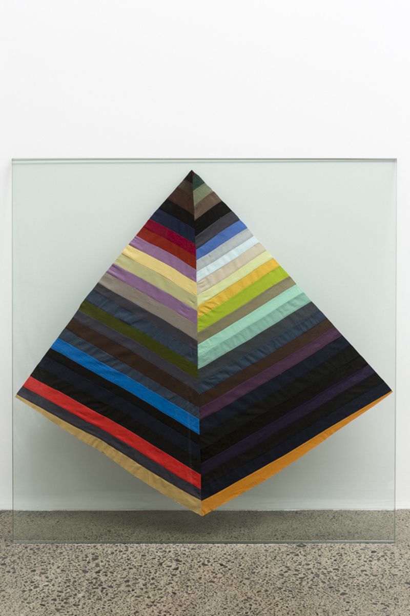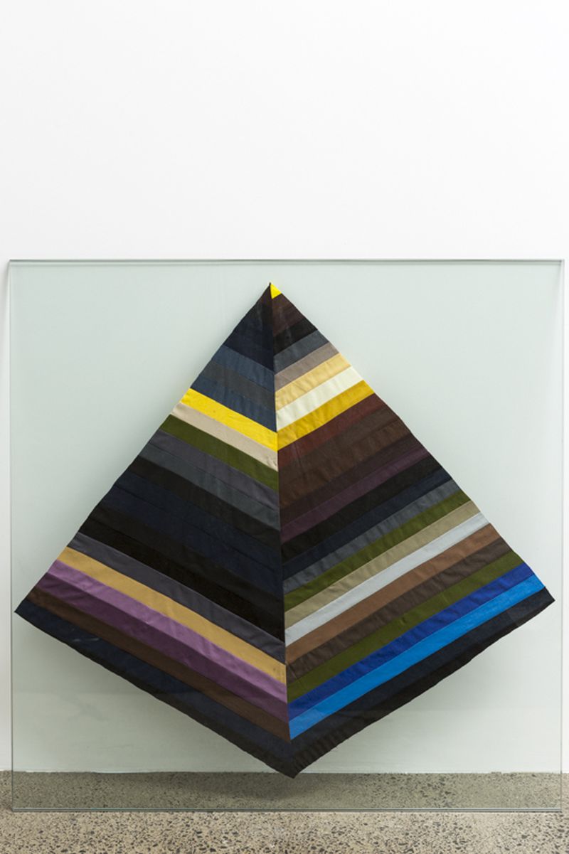 For They Say Ten Thousand Years, four banners shaped like pyramids have been crafted and fixed between panes of glass. Three of these banners rest against the wall while the fourth is elevated and held high in a protruding metal frame. These works, entitled Colour Schemes for Screaming Pyramids, employ dark and muddy colours that recall military or scout uniforms alongside garish toxic tones. The pyramid form was inspired by the winning entry in a competition to find a warning signal to be placed outside a planned nuclear waste storage centre outside of Las Vegas, Nevada.4 Howden-Chapman notes that ‘nuclear waste will remain dangerous for ten thousand years,’5 therefore the desire for a warning signal thus represents one kind of distance plan, an attempt to communicate with whatever entities might be around in ten thousand years’ time. The winning design was a hypothetical series of twenty-foot high pyramids carved from local granite. Inscribed on the monuments were inscriptions in English about the site, the date the waste was buried, the date it will be safe, and the face from Edvard Munch’s The Scream engraved at the apex of each pyramid.6