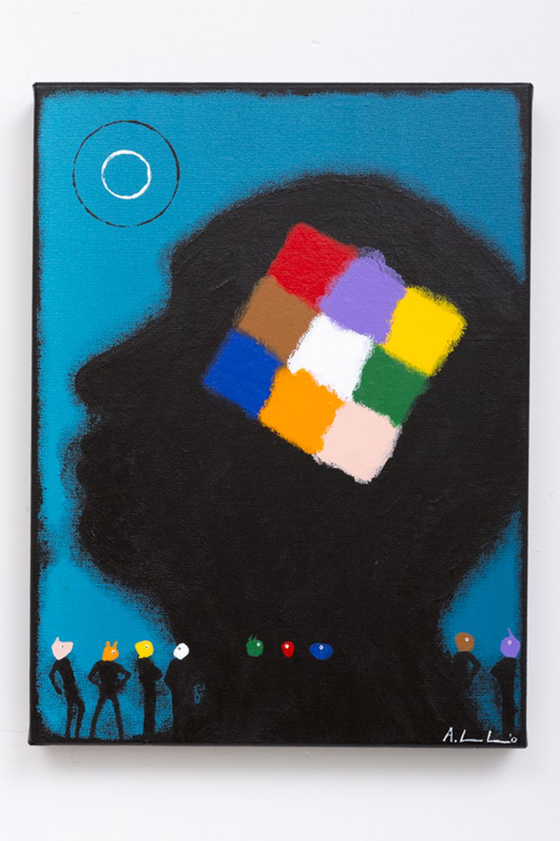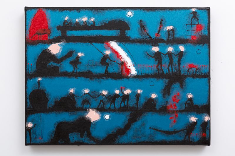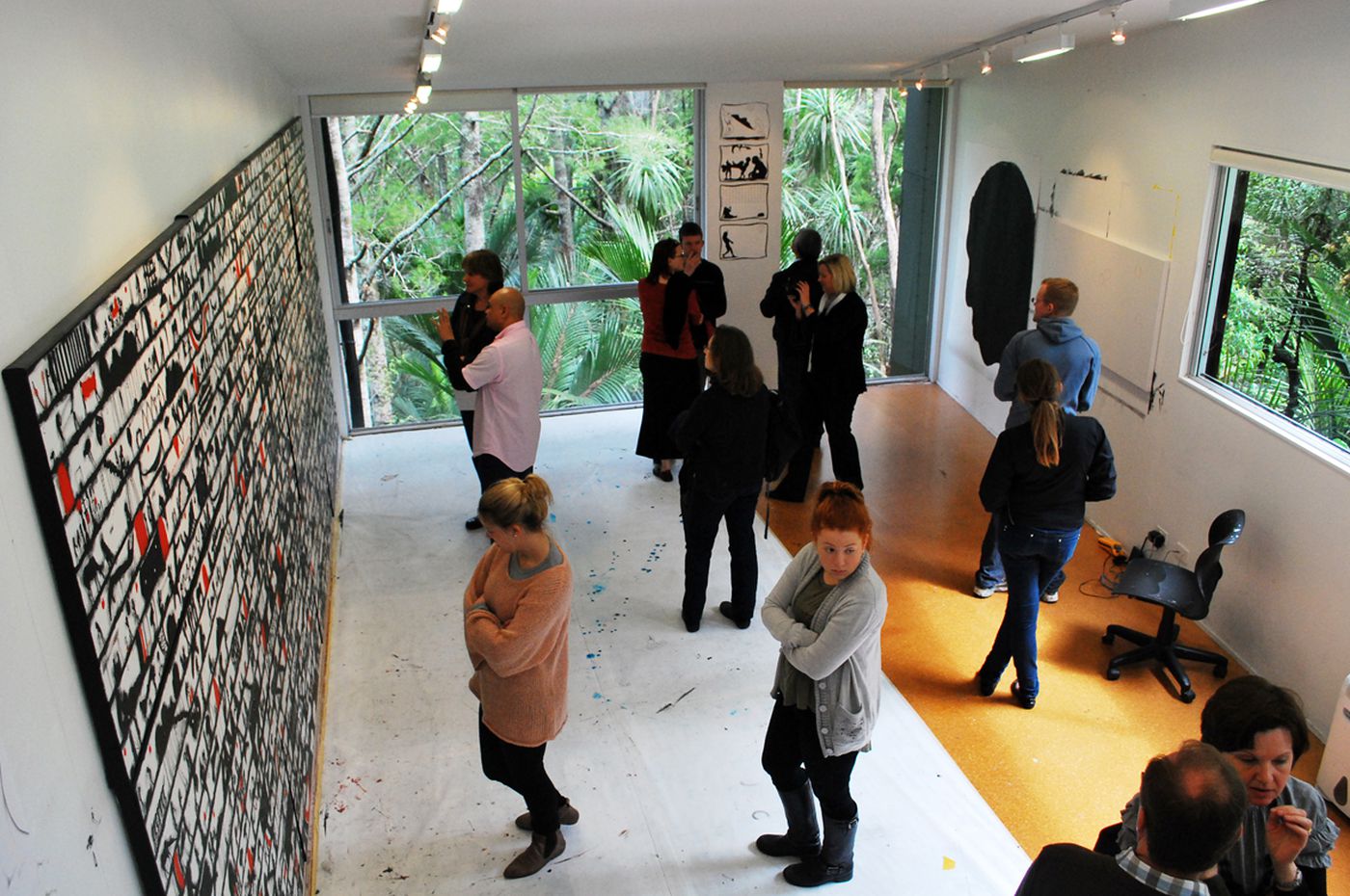 Drawing together threads from such disparate sources as Stone Age rock art, classical Greek vase painting, Egyptian hieroglyphs, and Samoan siapa cloth, Andy Leleisi’uao speaks with a distinctive visual language. Recurring motifs throughout the works provide visual touchstones for viewers and remind us of the inherent humanity of his creatures, and the universality of their struggle and endeavour within a limited existence.