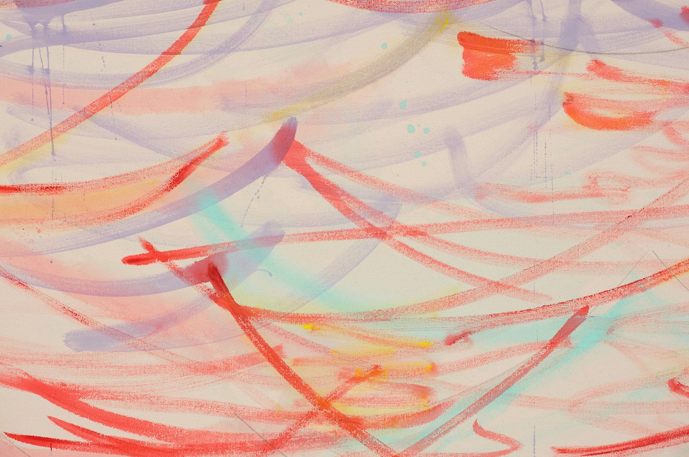 In a process akin to printmaking, Anoushka will often soak the canvas in water before painting, allowing the weave of the canvas to expand and hold the paint inside rather than merely on top of it. By scrunching the canvas and then smoothing it out again she creates a “network of creases,” building a ground that is, like yakisugi wood, “damaged but strengthened.” For the paintings in Carrying the Beast, Anoushka worked more often with dry canvas, but this carrying capacity of plant materials was still very much in her thoughts. An earlier version of the exhibition title was longer: She is in the Ink and Paper, Carrying the Beast. When I asked what drew her to these words, Anoushka said she had been thinking of publishing as a structure that holds ideas, fixing their fluid forms within the pulp and carrying them across time. As Le Guin put it, “a book holds words, words hold things. They bear meanings.” It is the printed matter of art forebears that reaches Anoushka. Anne and Etel, each enabled to place weight somewhere it would stay and disseminate, their definitive lines and marks bearing very different lives. I think how the paper is, though so far removed from those original wasps, still a kind of nest.