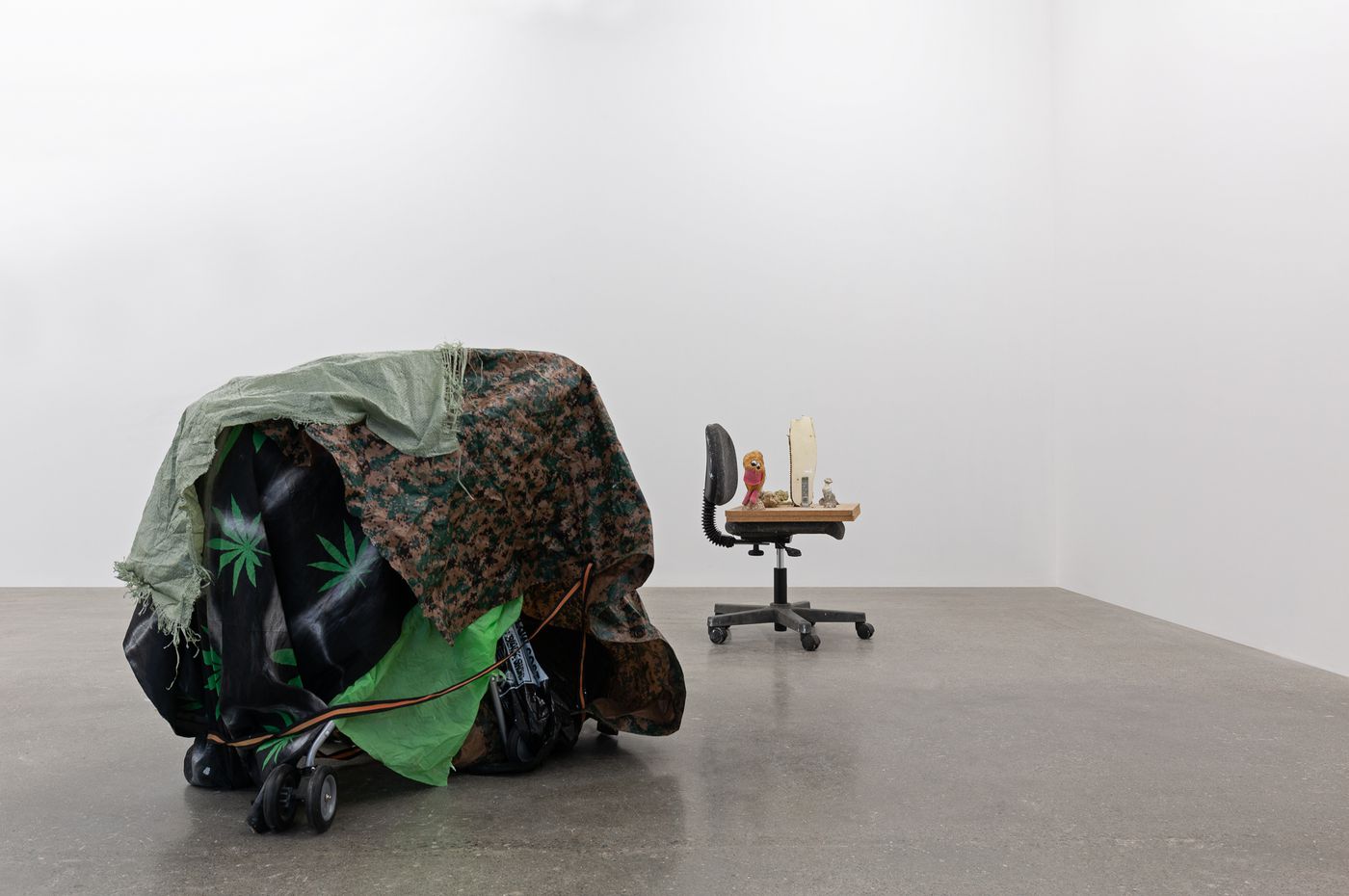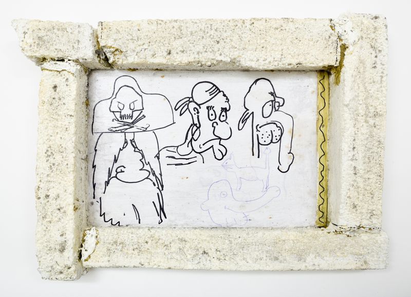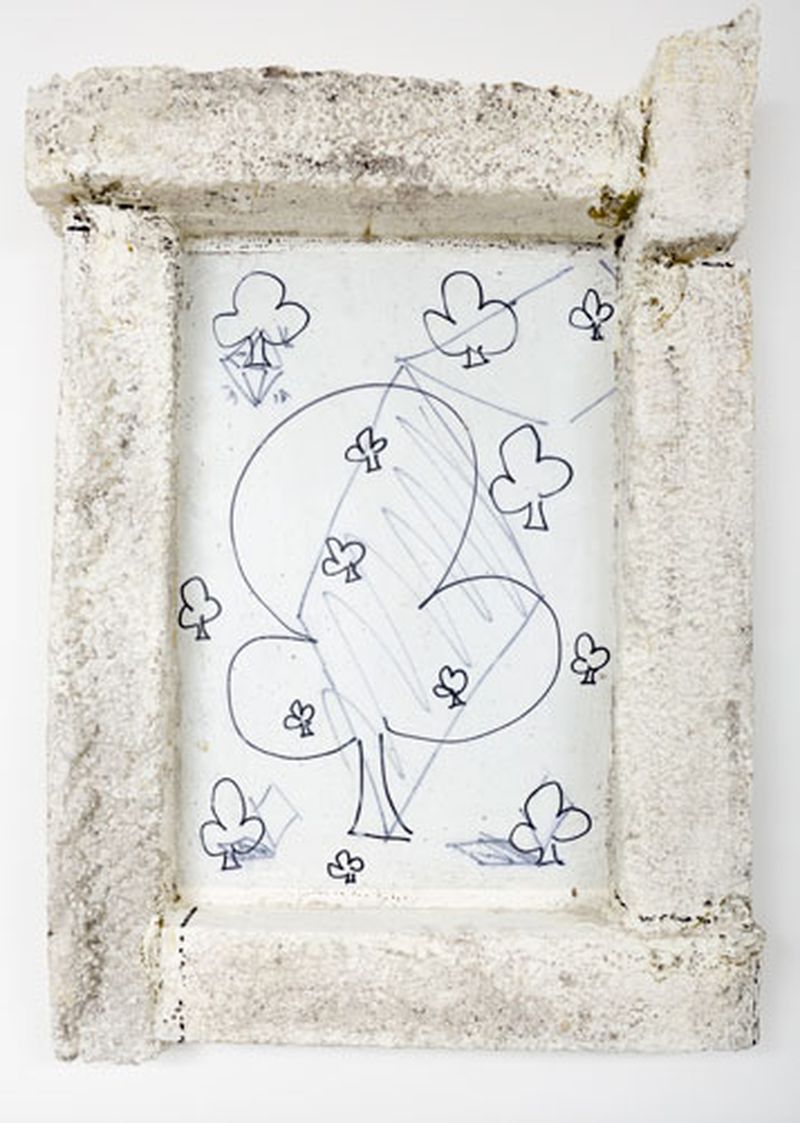 Study and Aces, in which the tropes are surrounded by disjointed polyurethane carpentry. Frames that are as shockingly out-of value the more they reassert their own terms of value. Which is why on one level we can leave the drawings where they are, as doodles, as interchangeable iconography, a fact reiterated by their appearance in another of Arps’ works, in which these tropes and similar others are carved into a picnic table.[vi] But then surely this fluctuation of value, both the inversion of Arps’ dandyism and the interchangeability of the image, of the trope, is not solely the object of the artist’s immersive vectors, even if he has, elsewhere, written of Scrooge McDuck’s literalisation of the fluency of capital![vii] No, such speculation will not do.