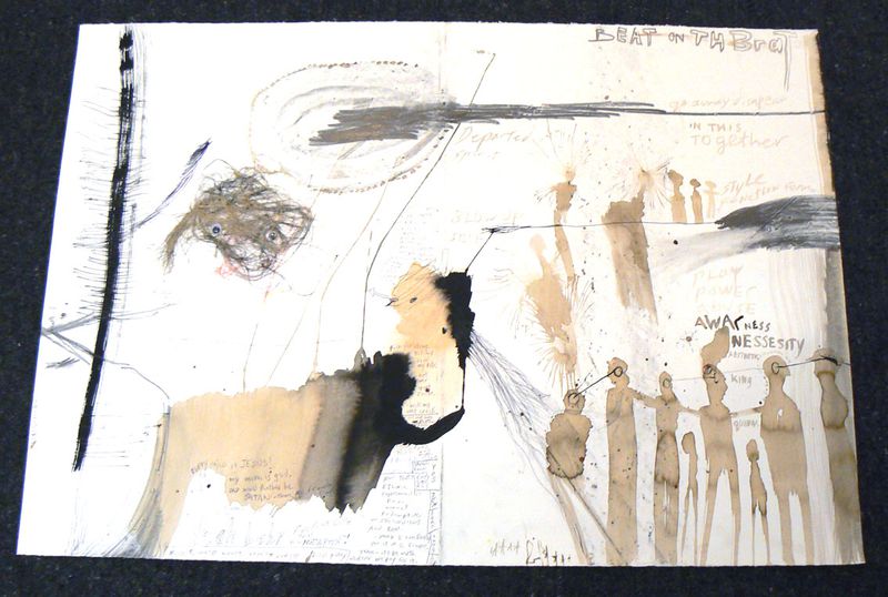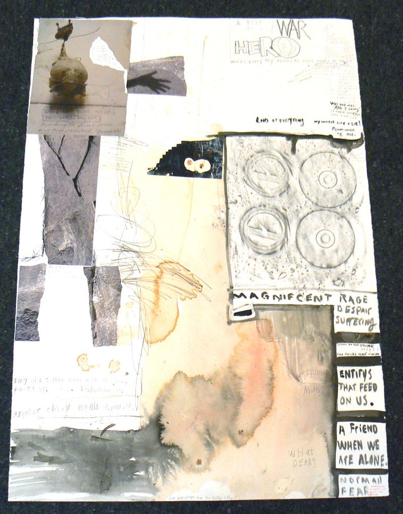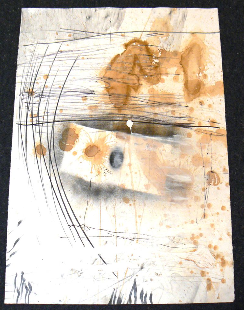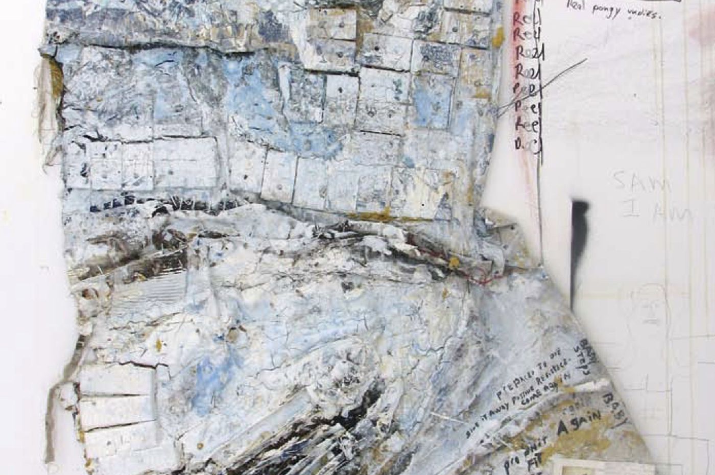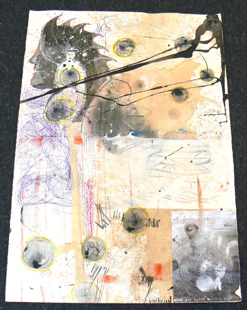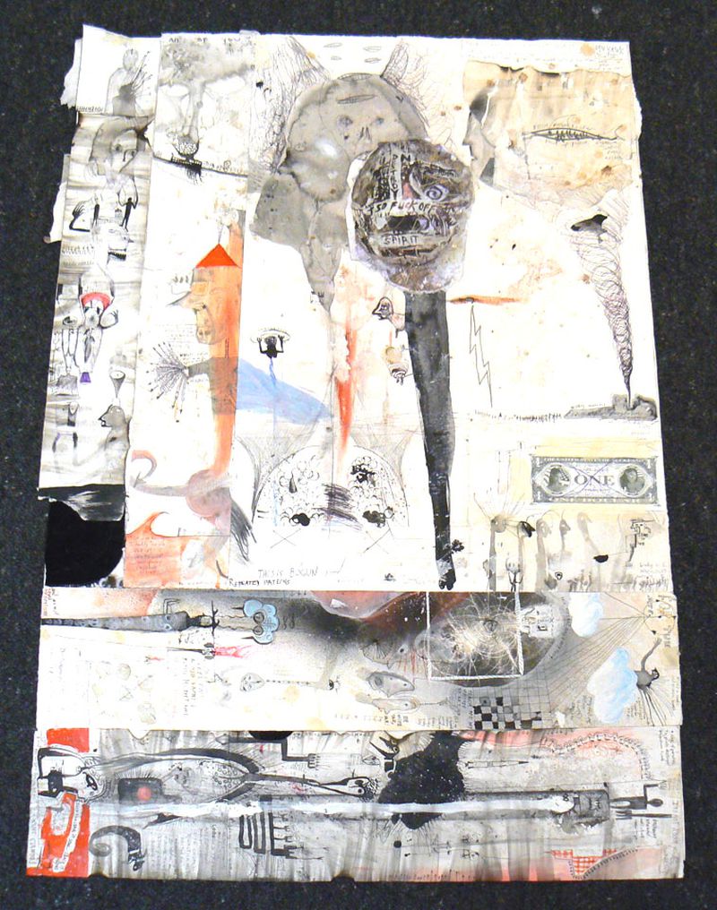 His materials are diverse – discarded domestic objects, along with stones, shells, fabric, and often the sharp edge of nails and wood. Areas are slashed through then stitched to hold just barely together, are burned around the edges, or have voids of blackest velvet. Fragments of earlier paintings are melded together, stacked into a structure that, like human endeavour, might make sense of it all. His work is urgently thoughtful, honest and direct. This is particularly evident in his drawings. Through creative exploration of materials he maps the territory of his psyche. Having bared all on the canvas, James Robinson prefers to let his work speak for him – and it’s true, first hand encounter is the only way to engage, and understand.