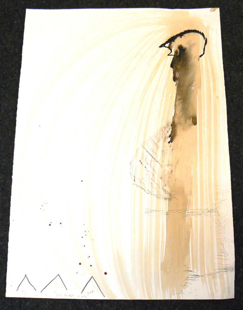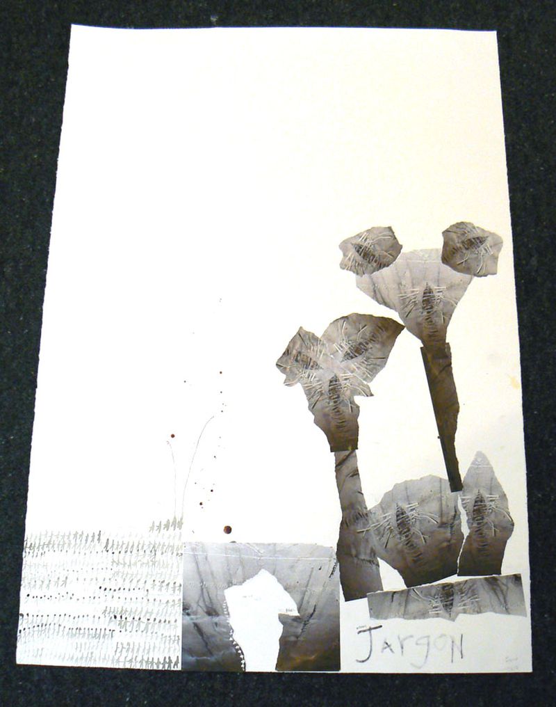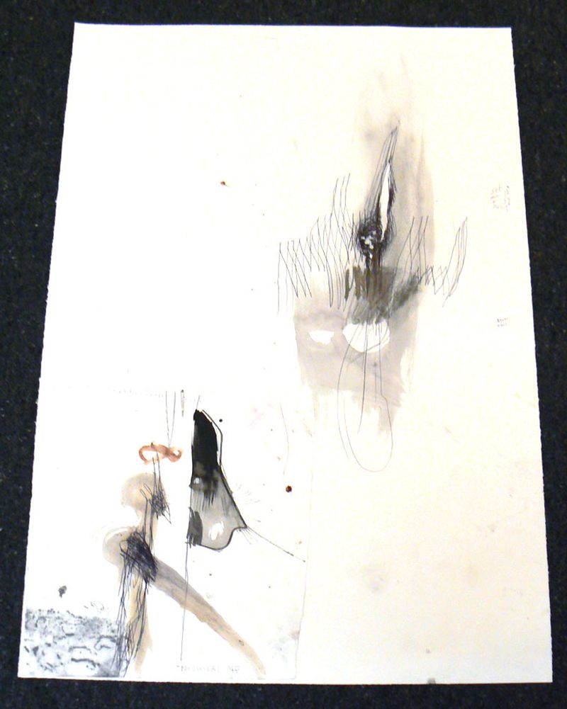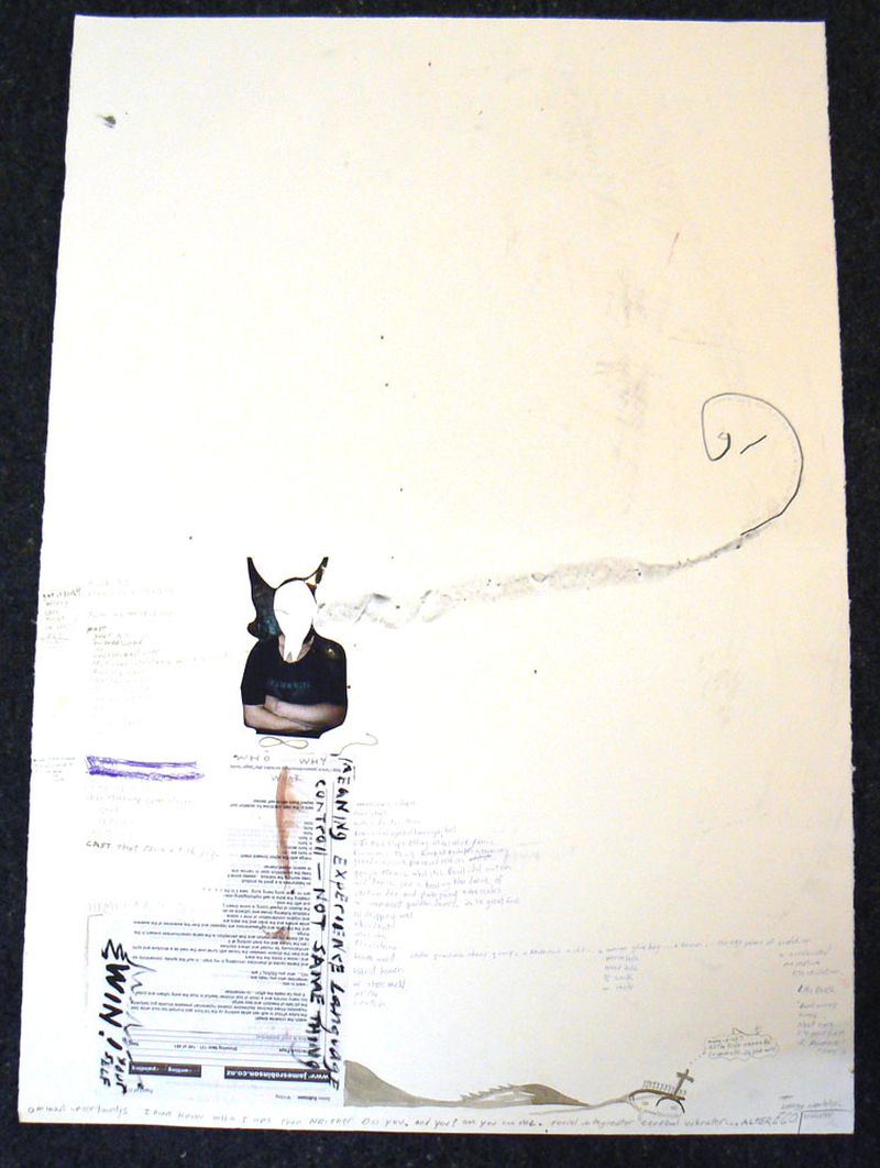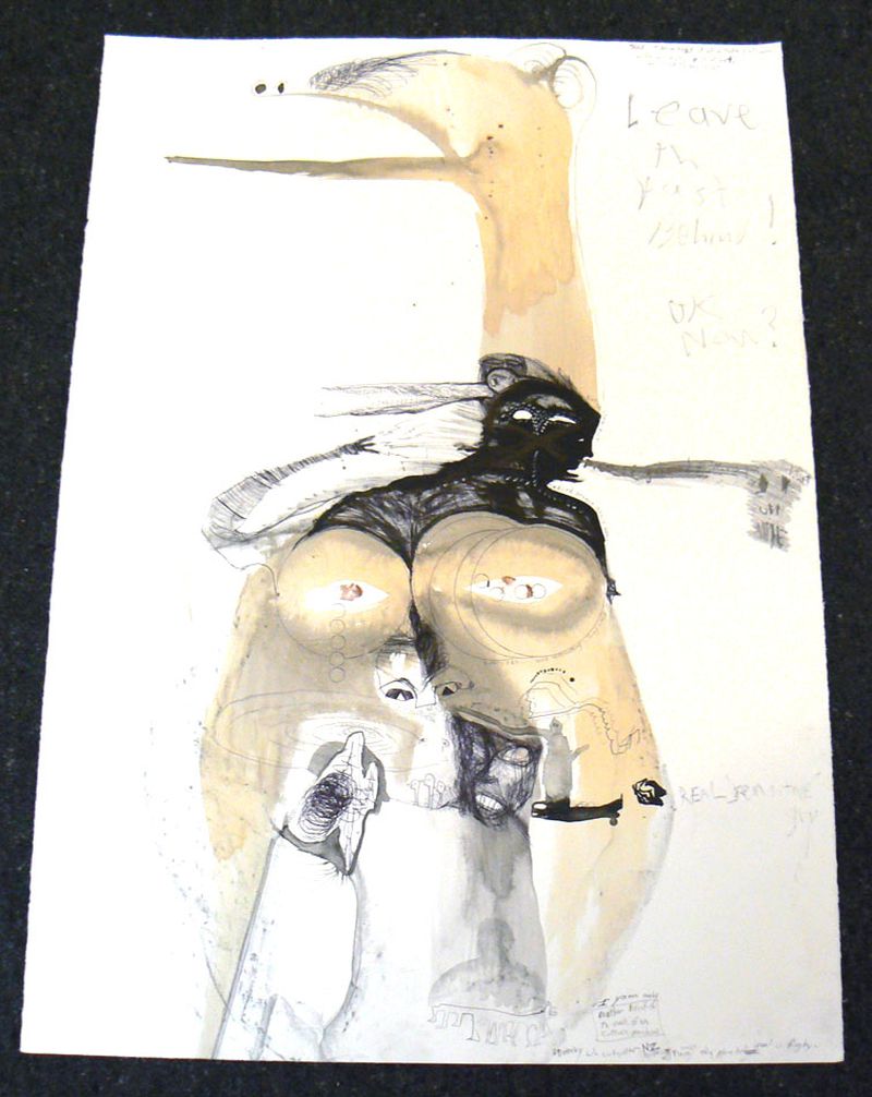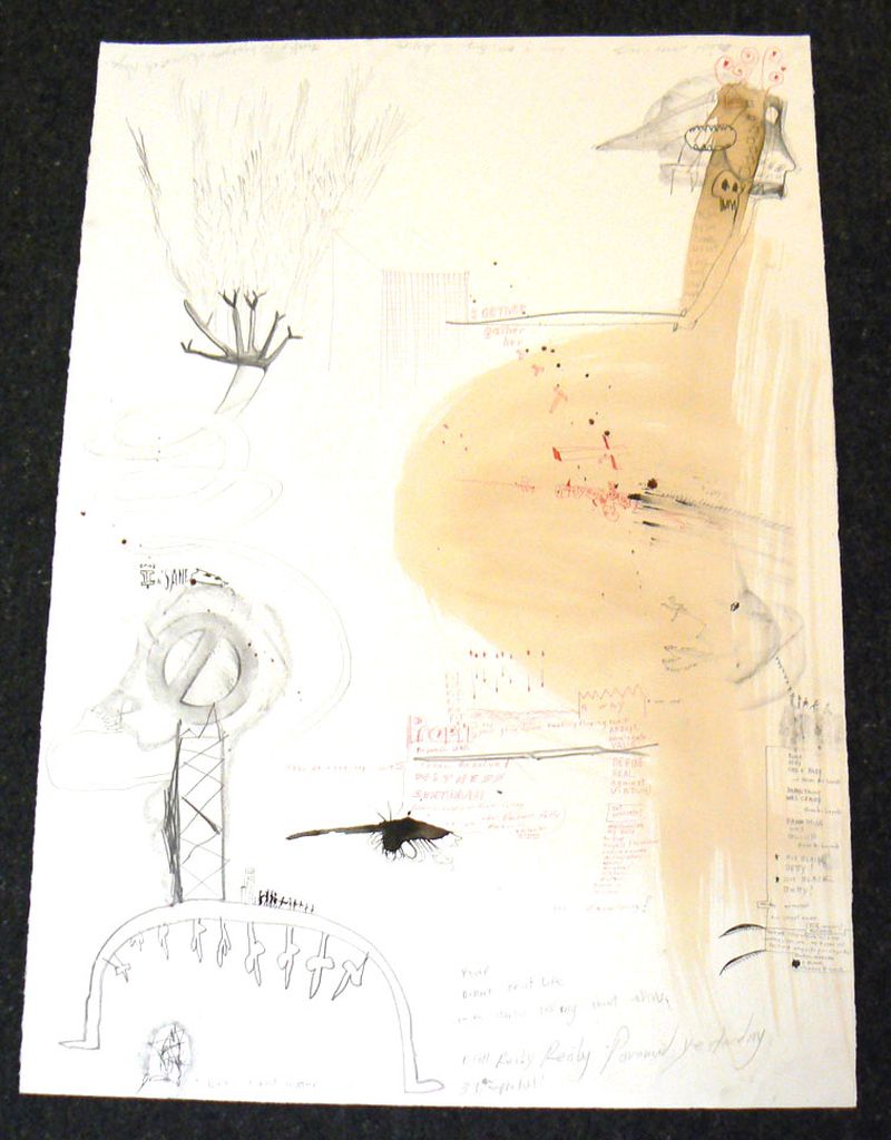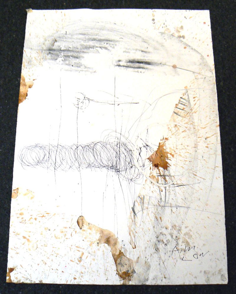 His materials are diverse – discarded domestic objects, along with stones, shells, fabric, and often the sharp edge of nails and wood. Areas are slashed through then stitched to hold just barely together, are burned around the edges, or have voids of blackest velvet. Fragments of earlier paintings are melded together, stacked into a structure that, like human endeavour, might make sense of it all. His work is urgently thoughtful, honest and direct. This is particularly evident in his drawings. Through creative exploration of materials he maps the territory of his psyche. Having bared all on the canvas, James Robinson prefers to let his work speak for him – and it’s true, first hand encounter is the only way to engage, and understand.
