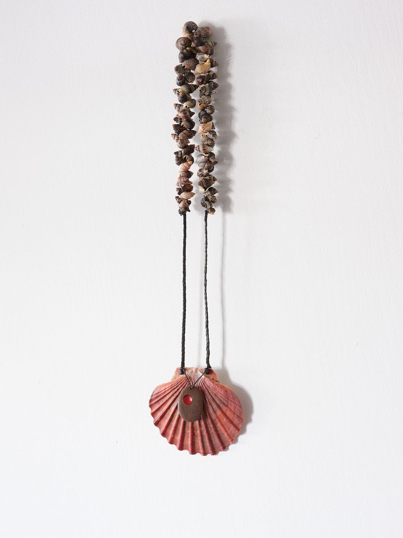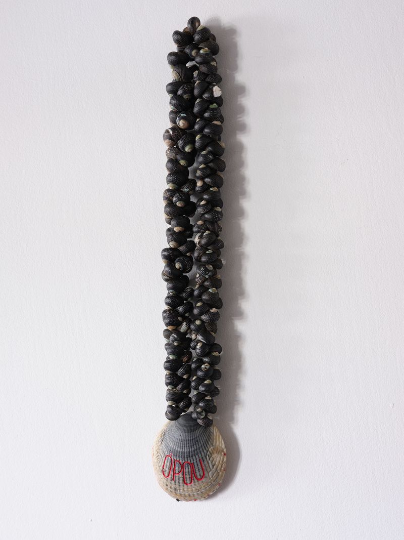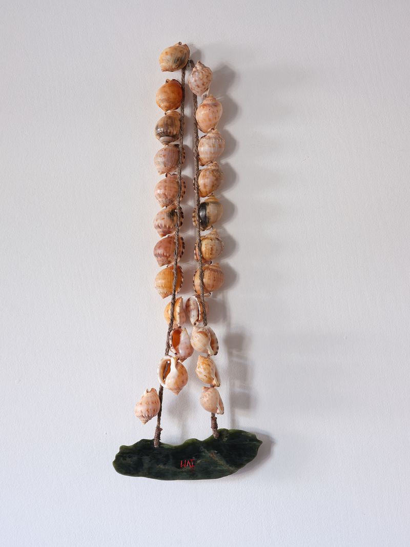 "Snail shells collected from Otitori (French Bay) form a lei, echoing their legacy as important indicators of a healthy beach and harbour. They are survivors, still showing their vibrant patterns and colours. A tipa (scallop) and atua made of pīpīwai (sandstone) remind us to take care and be good kaitiaki—or perhaps someday all this will disappear." - Neke Moa