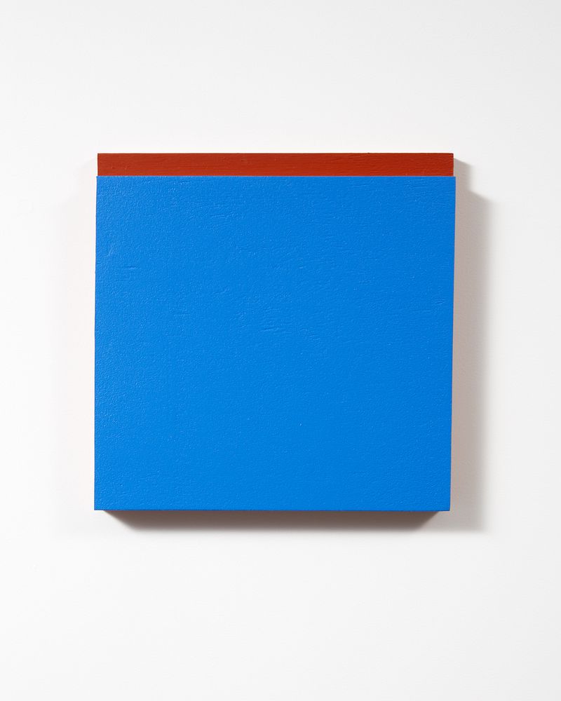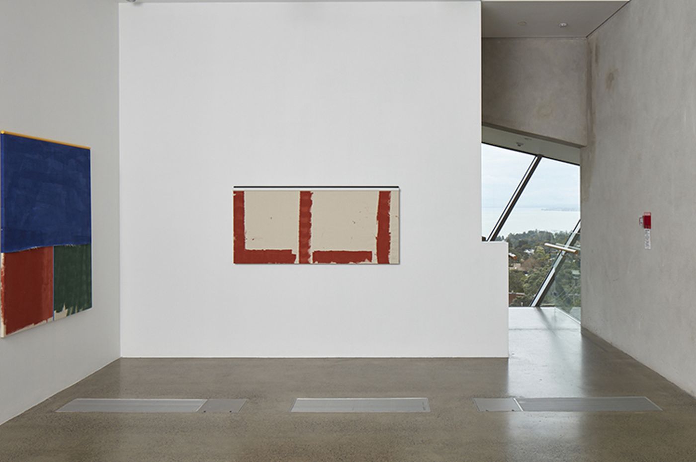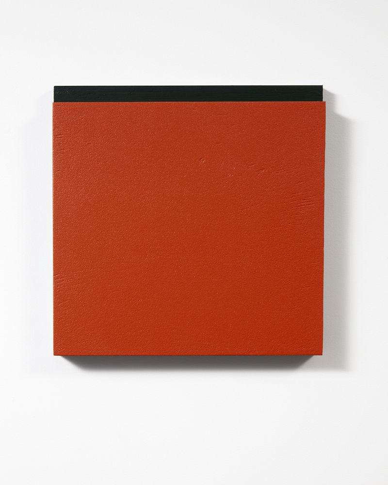 Looking at the face of one work, I see McCahon House, which— like so many homes in the Waitākere Ranges—is painted a similar rust red. This is not to say that the work is necessarily meant to refer to the building, much less represent it. Perkins is drawing on what’s at hand, including the big box hardware centre ‘down the road’ in New Lynn, and the timber and paint products available therein. And this process is as much about finding parameters, an order for his practice, as it is about nodding towards the local built environment, the home handy-worker, McCahon making do with a pot of enamel house paint and an offcut of linen.